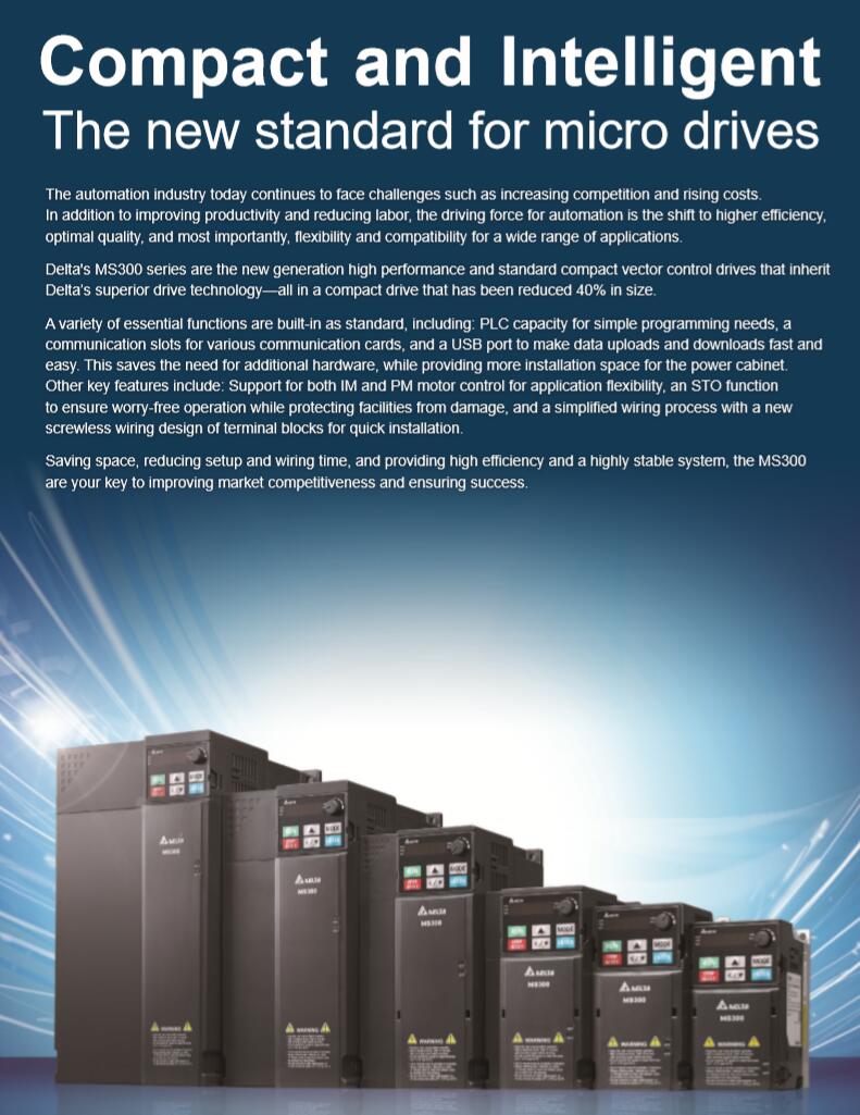 Delta's MS300 series is a standard compact vector control drive that inherits Delta's superior drive technology. It supports both IM and PM motor control for application flexibility and provides STO safety mechanism. Also built-in various essential functions, including PLC capacity for simple programming needs, a communication slot for various communication cards, and a USB port to make data uploads and downloads fast and easy. Saving space, reducing setup and wiring time, while providing high efficiency and stability system -all included in the MS300 series with drive size reduced up to 40%.