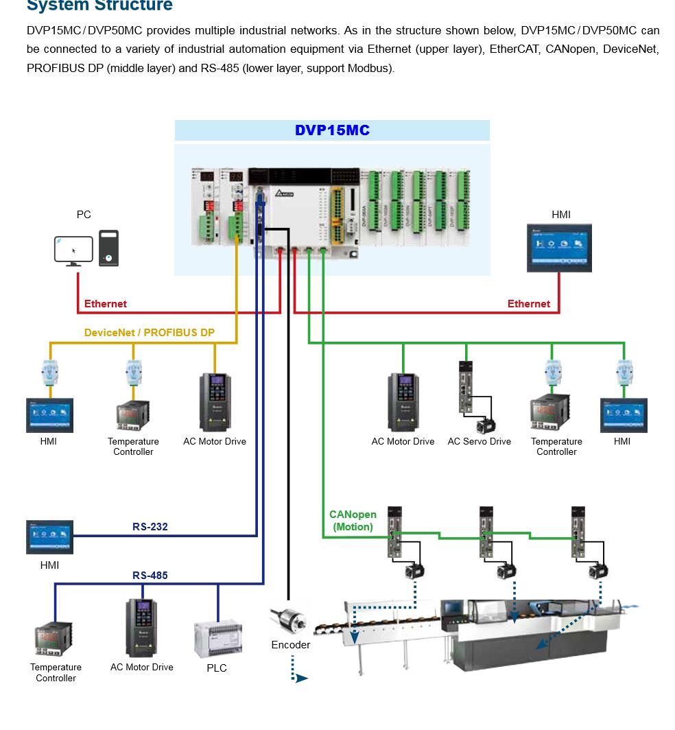 Delta's DVP series programmable logic controllers offer high-speed, stable and highly reliable applications in all kinds of industrial automation machines. In addition to fast logic operation, bountiful instructions and multiple function cards, the cost-effective DVP-PLC also supports various communication protocols, connecting Delta's AC motor drive, servo, human machine interface and temperature controller through the industrial network in to a complete "Delta Solution" for all users