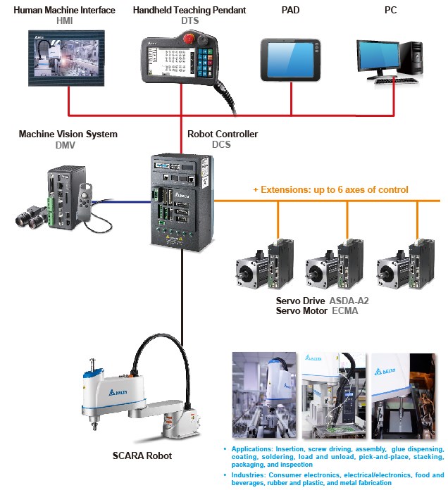 Delta's SCARA robots can easily integrate with control units and peripheral components to form highly integrated robot workstations. They can be applied in a wide range of industries including consumer electronics, electrical /electronics, rubber and plastic, metal fabrication and for processes such as screw driving, dispensing, assembly, load and unload, soldering, transporting and packaging .