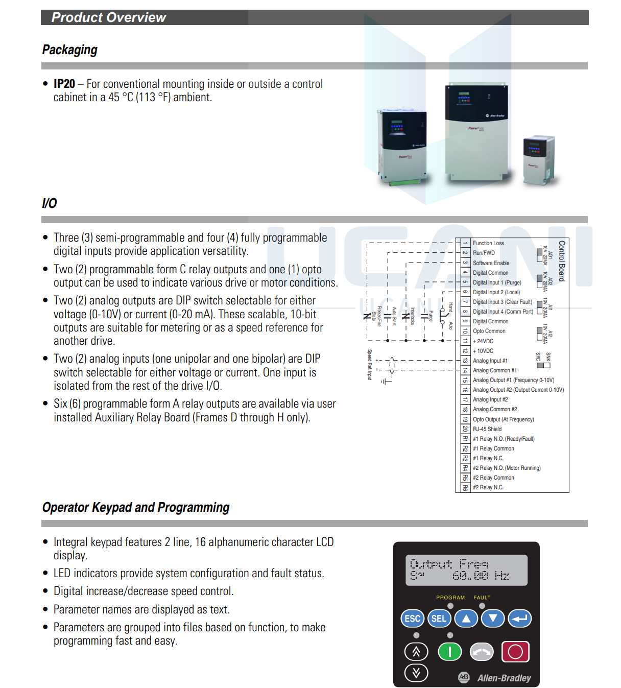 Drive overload protection, flying start, purge and damper input, hand/off/auto, and sleep/wake features